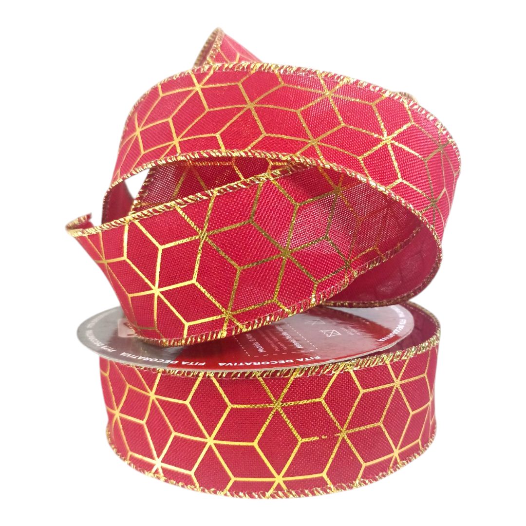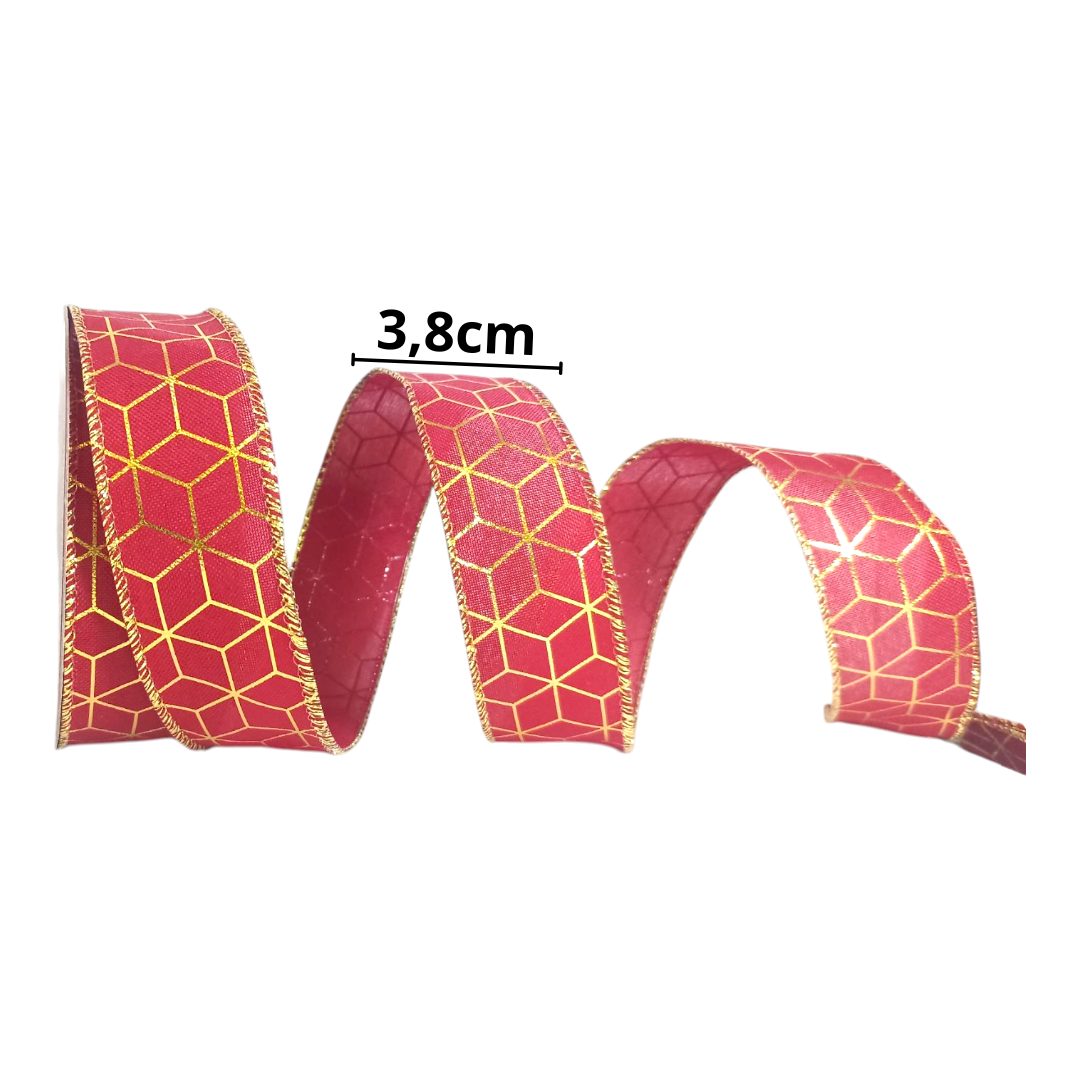 Essa fita possui detalhes geométricos destacados em dourado, deixando seu fundo vermelho ainda mais interessante e natalino!